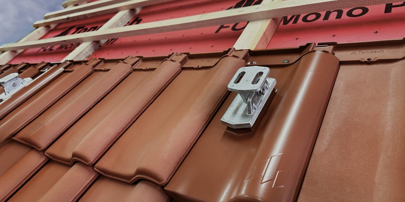 Da die System-Grundplatte einen Tondach Ziegel 1:1 ersetzt, ist kein mechanisches Bearbeiten der Ziegel für die PV-Installation nötig. Das spart nicht nur Zeit, sondern verhindert auch zuverlässig etwaige Verletzungen der Dachhaut und das Risiko von Wassereintritt oder anderer Folgeschäden. Das Tondach behält so optimal seine Grundfunktion.